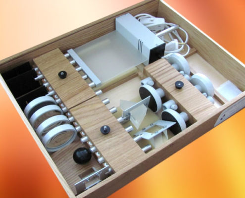 Demonstration set «Geometric optics» enables to demonstrate geometric optics laws and to prepare students for the laboratory work on optics in the section «Light phenomena» in the 8 form and in the section «Optics» in the 11 form.