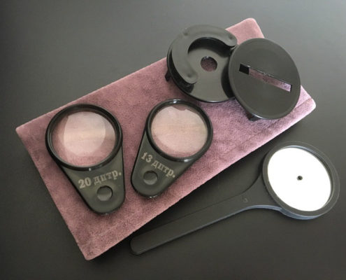 High diopter lenses: 5 dptr, 20 dptr, 30 dptr, 40 dptr, 60 dptr. The lenses are used for indirect ophthalmoscopy.